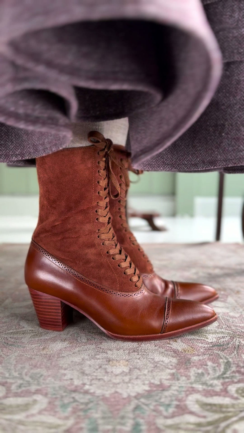 De er helt typiske for den Edwardianske periode 1900-1910 med et langt, smidigt støvleskaft, en høj, robust hæl på 6 cm og en lang spids snude. Læderet har et fint præget hulmønster, og kombinationen af ruskind og blank læder giver støvlerne et meget autentisk og råt udtryk. Indvendigt er der bomuldslærred, fuldstændig som ved en original støvle fra denne periode.