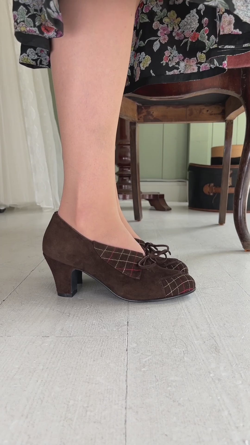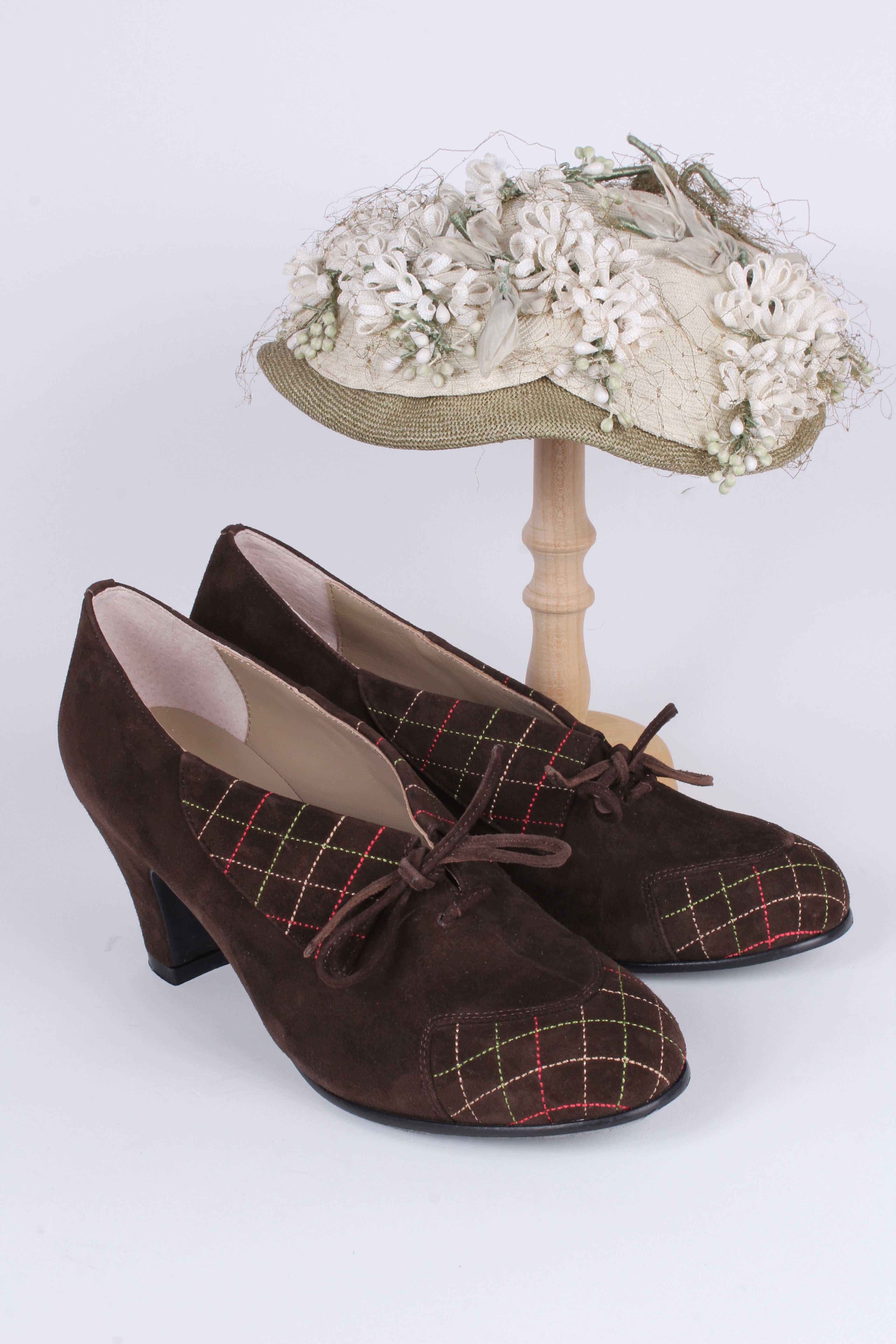Skoene er typiske for 1940’erne med lidt rund snude og elegante høje hæle som giver et flot og glamourøst udtryk. Hælenes lidt kraftige facon giver god komfort og stabilitet. Snørebåndene er kun til pynt, og skal ikke åbnes når skoen tages på.