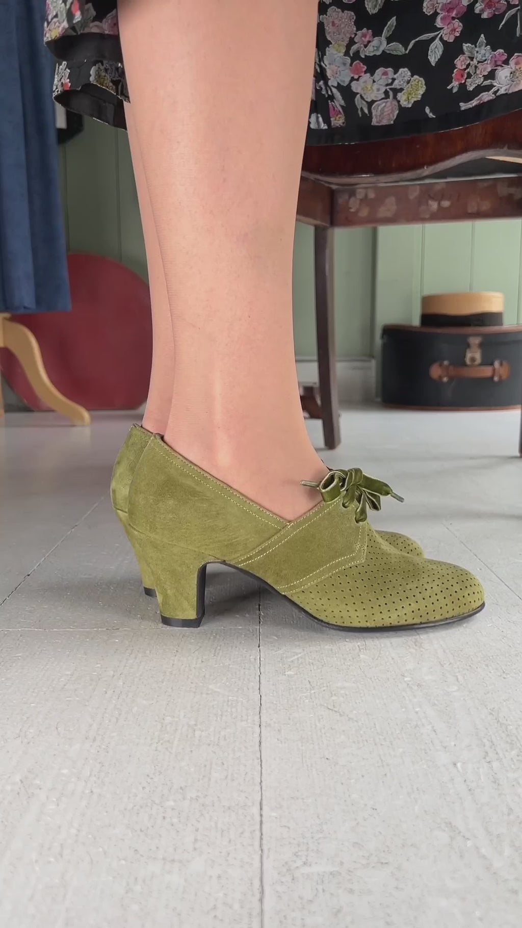 1940'er pumps i ruskind med snøre og hulmønster - Grøn - Esther