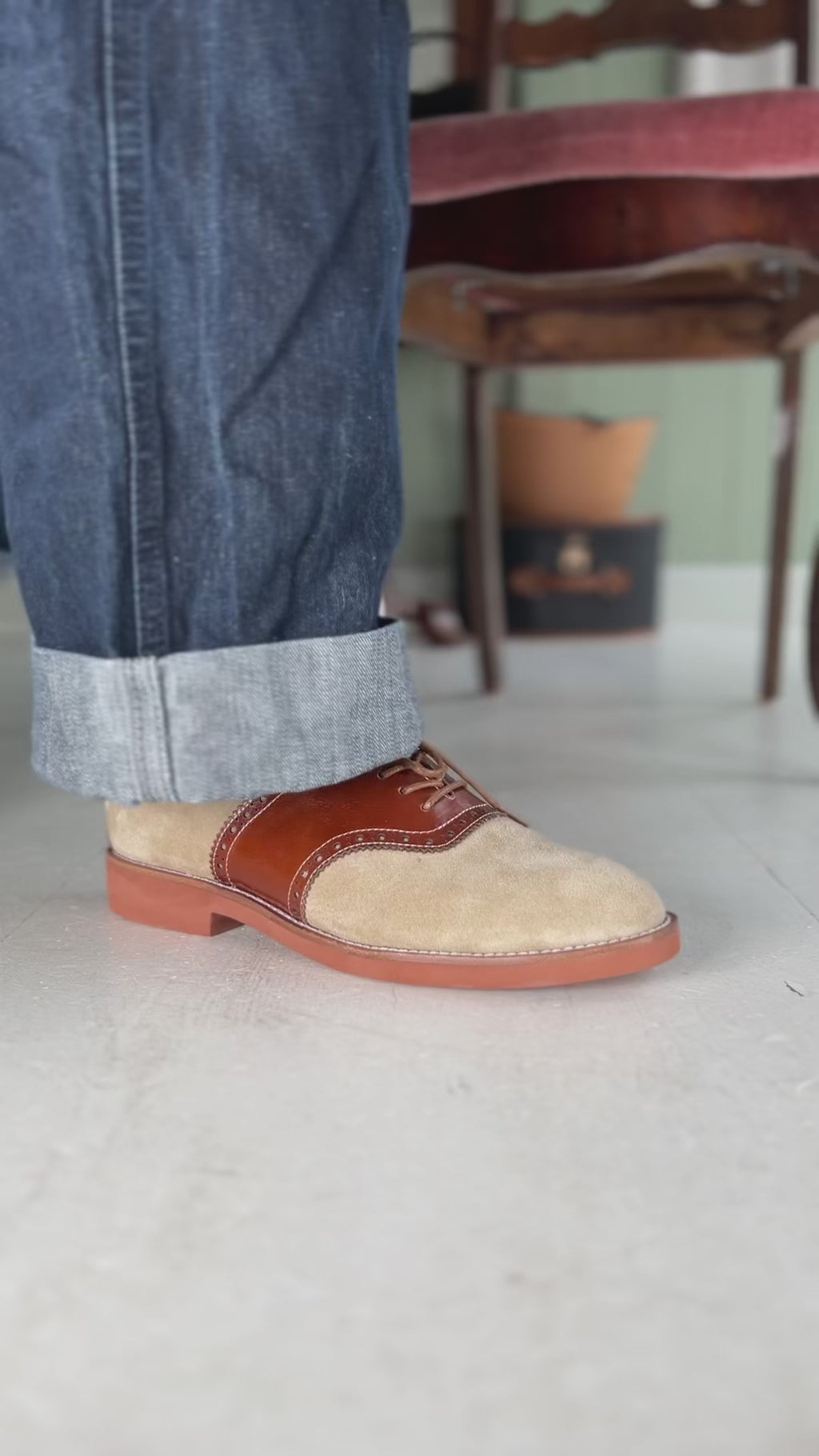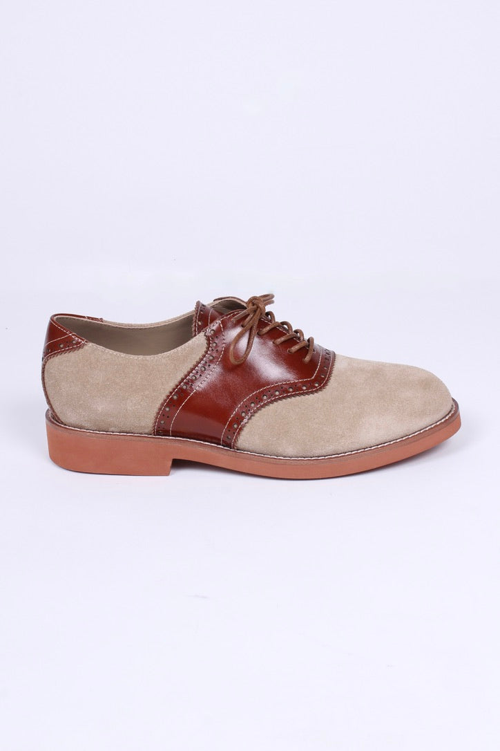 Disse flotte og klassiske tofarvede 1950'er inspirerede oxford snøresko er fremstillet i ruskind og læder. Læderdelene er dekoreret med uformelt brogue hulmønster (bag på hæl og midt på vristen).