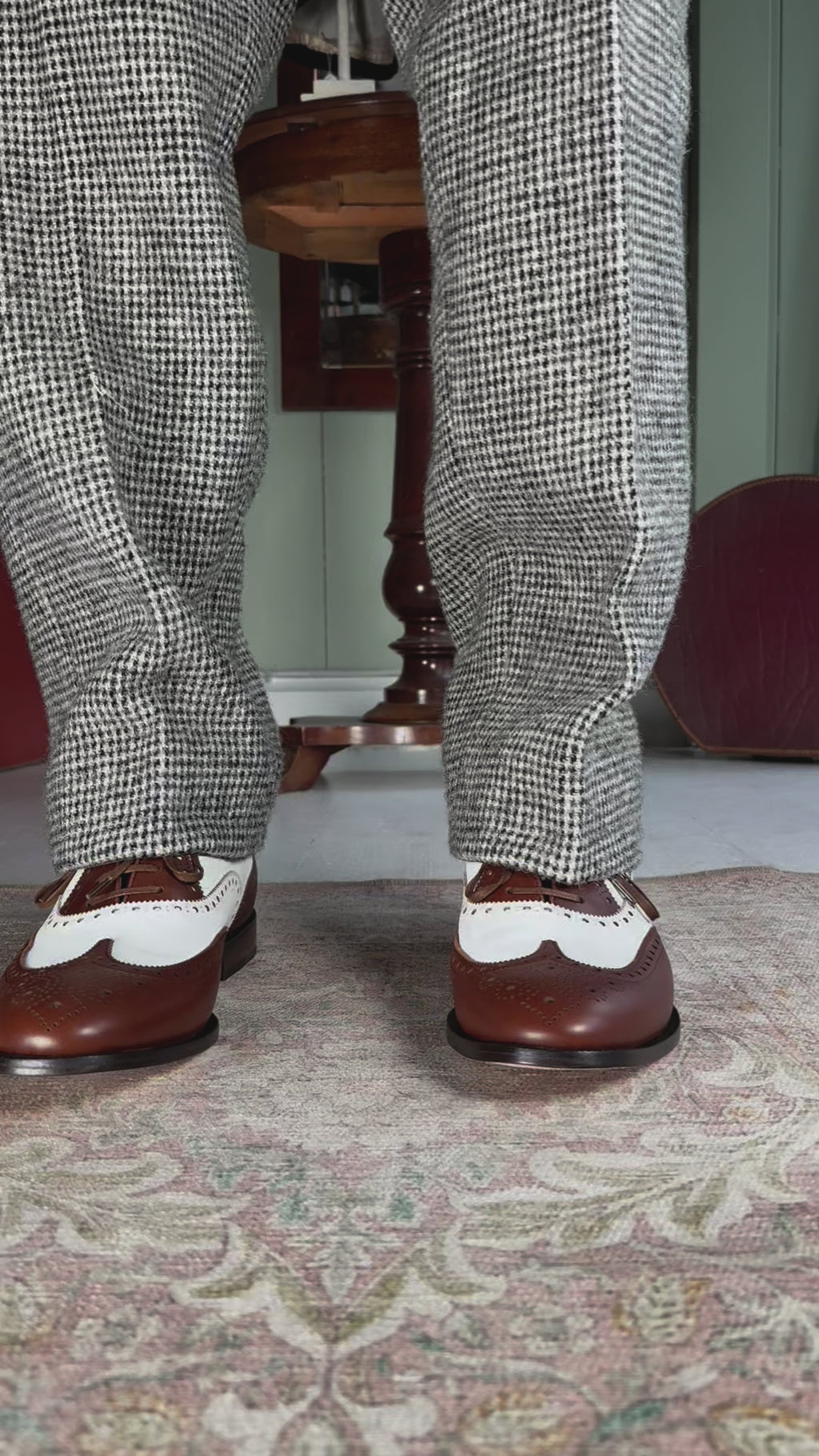 Nice colourway blending brown leather with off white nu buck gentlemen’s spectator shoes , they need the customary break in period as I found when wearing for the first time but the shoes tend to soften quickly and keep their shape well , I would recommend purchasing a pair and if memery decide to produce a black leather and nu buck version I would definitely be interested