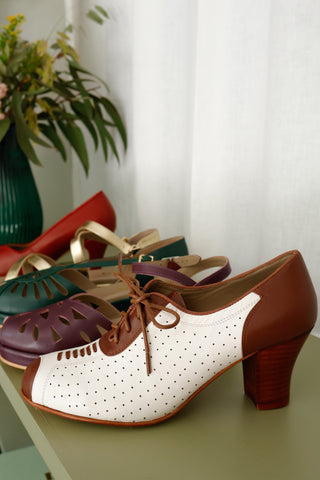 Dame 1950'er oxford snøresko i læder og ruskind. Cognac / sand - Elliot.