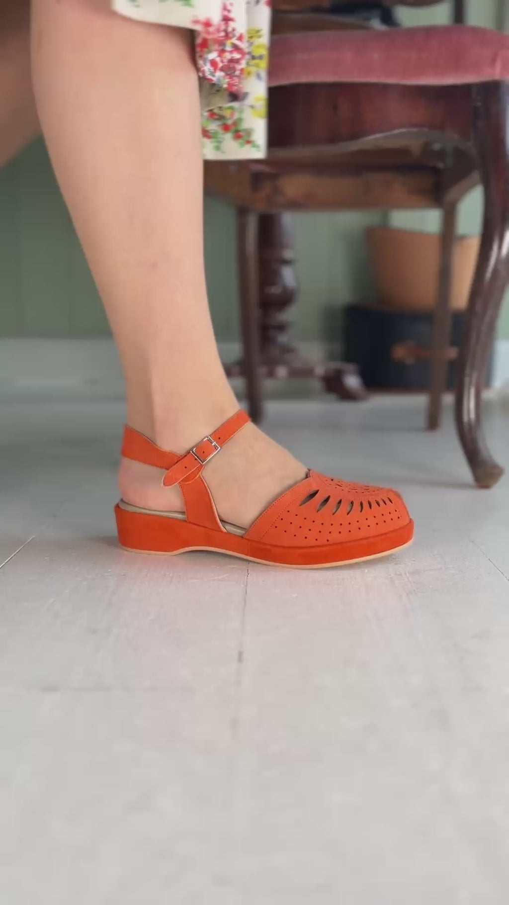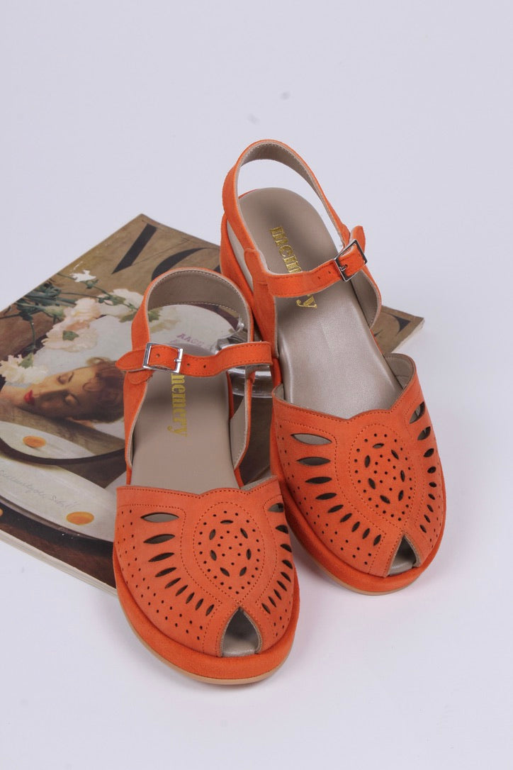 Disse feminine wedge-sommersandaler, inspireret af 1940'erne og 1950'erne, har en smuk plateausål og en justerbar ankelrem. Fremstillet i blødt ruskind med et delikat, håndlavet hulmønster, kombinerer de vintage charme med moderne komfort.