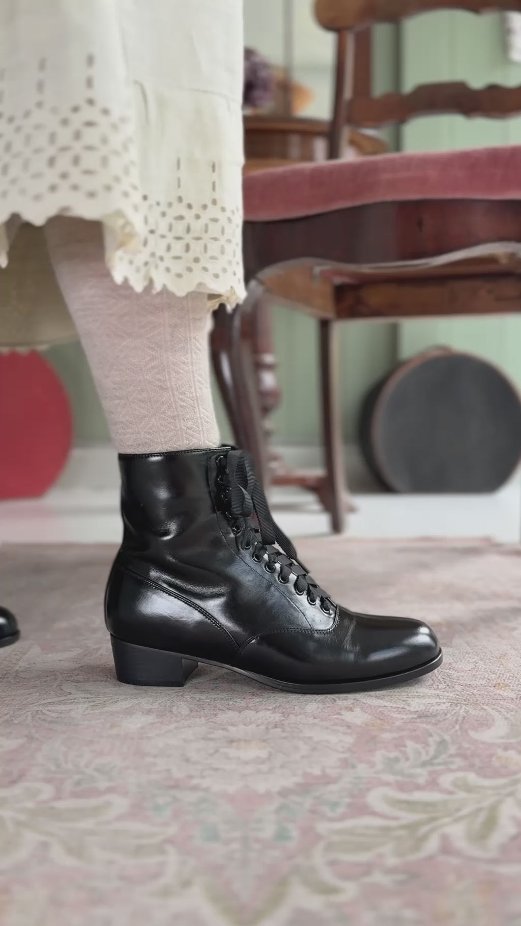 Featuring a spacious, round toe and a 3.5 cm high heel, the shape and height of the heel offer optimal comfort and stability. The boots, which feature wide ribbon shoelaces, have leather soles and a soft sheep leather insole—genuine to the original boots of this period.