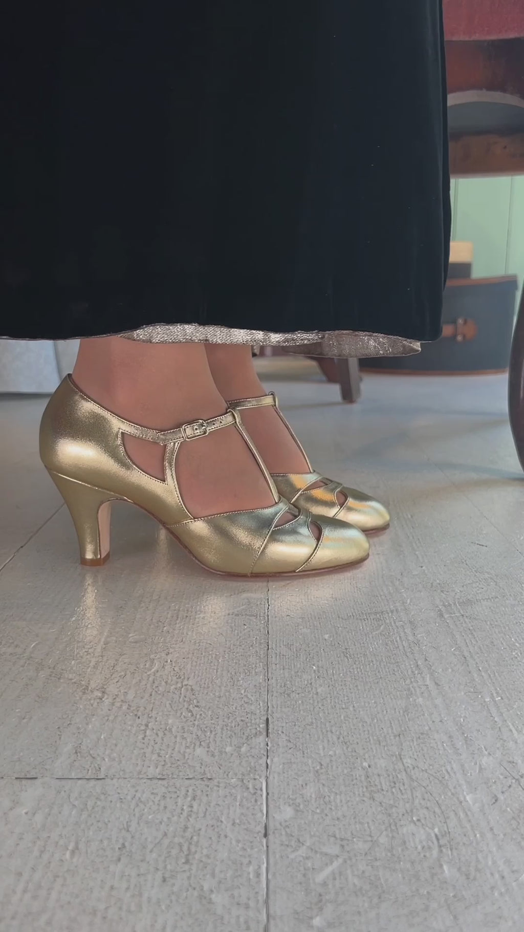 Helen is a vintage-inspired evening shoe that captures the elegance of the late 1920s and early 1930s. Featuring the iconic T-strap elegantly fastened with a single buckle at the ankle, this design is both timeless and refined. Feminine cutouts on the vamp and a high, gracefully curved Spanish heel evoke the era's glamour, while the almond-shaped toe with a subtle point adds sophistication.