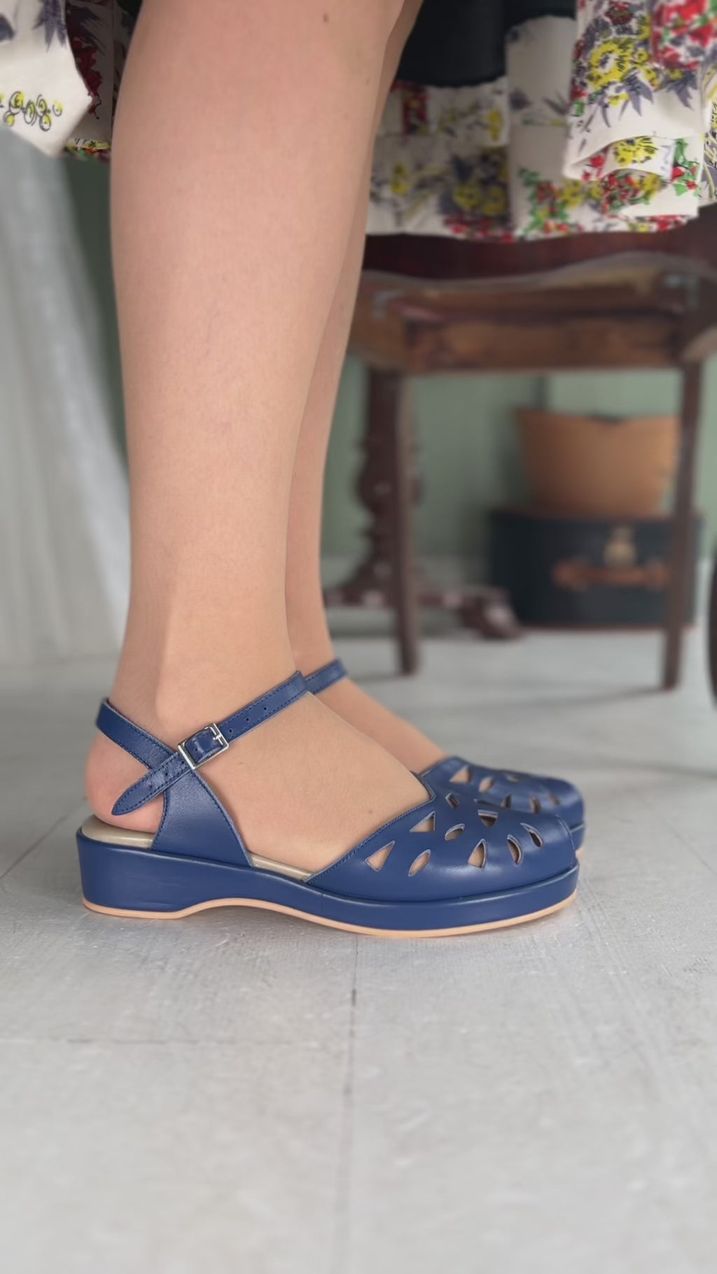 Classic summer wedges inspired by the late 1940s and early 1950s. Crafted from full-grain leather, these sandals feature an elegant cutout pattern that enhances their feminine appeal. With peep toes and a secure, adjustable ankle strap, closed with a metal buckle, they offer both style and comfort. The soft silicone inserts beneath the leather sole ensure a cushioned fit, making these shoes perfect for all-day wear.