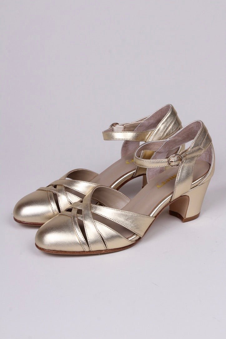 These feminine 1930s-style sandals feature an ankle strap with an adjustable buckle for closure, an almond-shaped toe, and a medium-high, slightly curved heel. The 5,5 cm high heel is perfectly proportioned and accurate to the period, offering comfort and stability, making them suitable for daily and evening use. The leather outsole enables flexibility and breathability.