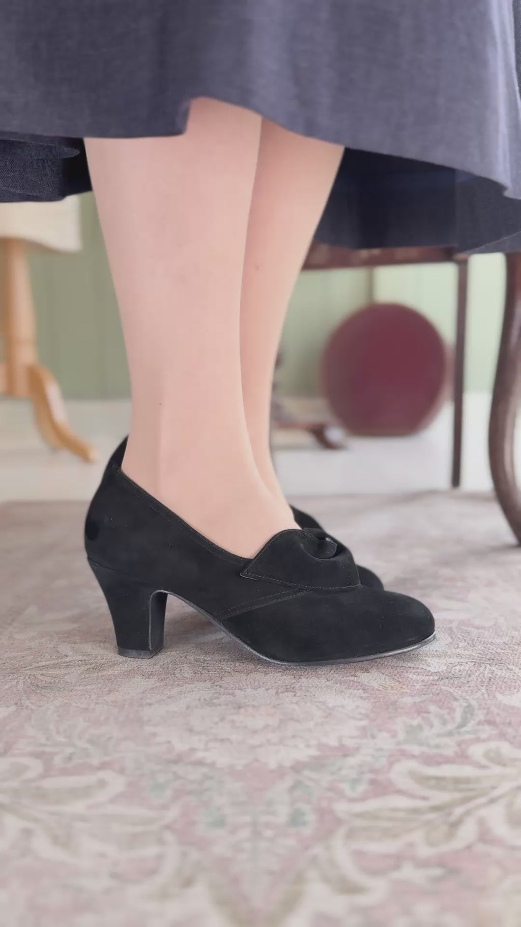 1940s-style suede pumps featuring a 6,6 cm high, elegant heel with a slightly curved, sturdy construction for comfort and stability. A rosette adds a classic 1940s touch, while the leather outsole provides flexibility and breathability. Strategically placed silicone inserts beneath the leather insole ensure all-night comfort.