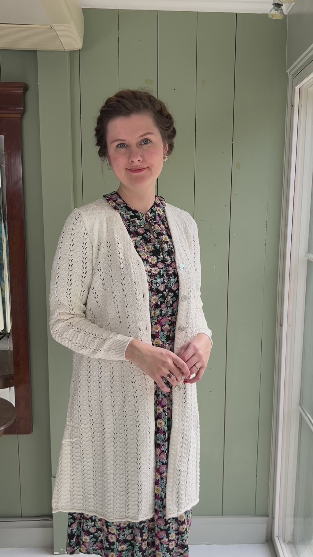 Fin 1930'er inspireret mellemlang sommerfrakke / cardigan fremstillet i lækkert blødt garn af 85% bomuld og 15% merino uld med smukt påfugle hulmønster. Frakken er med lange ærmer og v-formet halsudskæring, hvilket gør jakken meget anvendelig over kjoler og skjorter med revers. Øverst er der kort bærestykke med fint mønster og herfra går jakken ned i en smule A-facon. Lukkes med smukke knapper af perlemor.