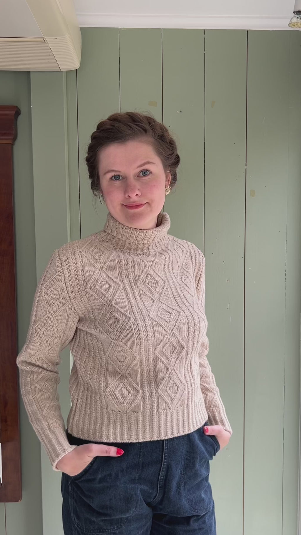 Blød og ekstra varm 1940'er-inspireret vintage-pullover, fremstillet i 100 % ren merinould med et smukt kabelstrikmønster. Pulloveren har en rullekrave og et enkelt, klassisk snit. Ærmelængden kan justeres med den brede ribkant, som nemt kan bukkes op efter behov.