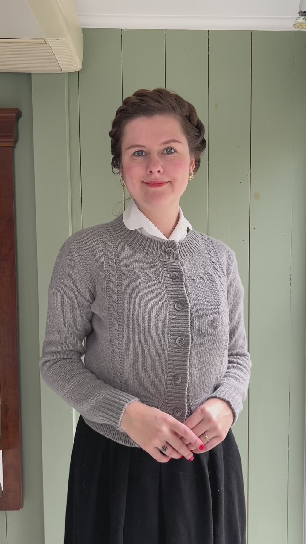 Sød og feminin 1940'er / 1950'er inspireret cardigan fremstillet af 100 % ren Merinould med dekorativt kabelmønster. Cardiganen er figursyet og fremhæver barm og talje. Længden er en smule kort, og den går til lige under taljen. Blusen er med bred ribkant under taljen, hvilket gør blusen klædelig til kjoler, højtaljerede nederdele og bukser. Ærmerne er lange, tætsiddende og afsluttes med ribkant. Blusen lukkes med 7 knapper i matchende farve.