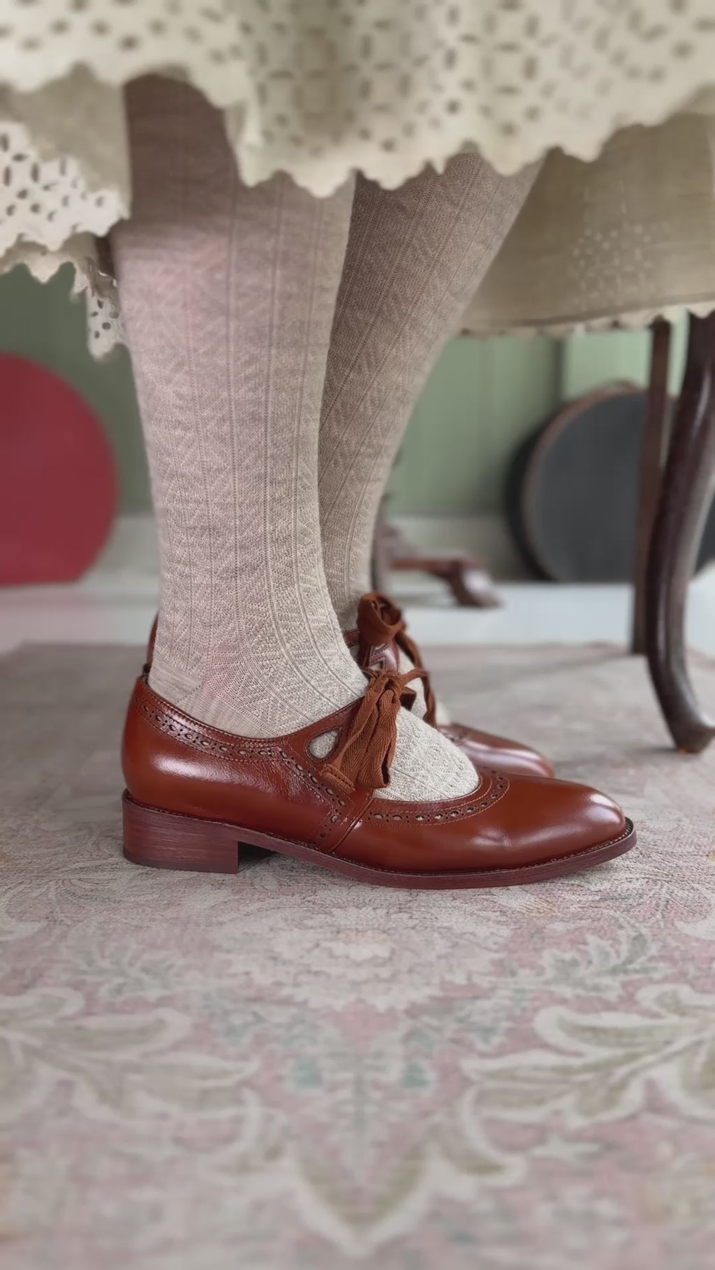 Disse smukke snøresko forener klassisk elegance med moderne komfort. Fremstillet i kvalitetslæder med håndlavede udskæringer og et delikat hulmønster, fanger de essensen af 1920’ernes og 1930’ernes tidløse stil. De brede bomulds snørebånd sikrer en perfekt pasform, mens den lave hæl giver både praktisk komfort og stabilitet til hverdagsbrug.