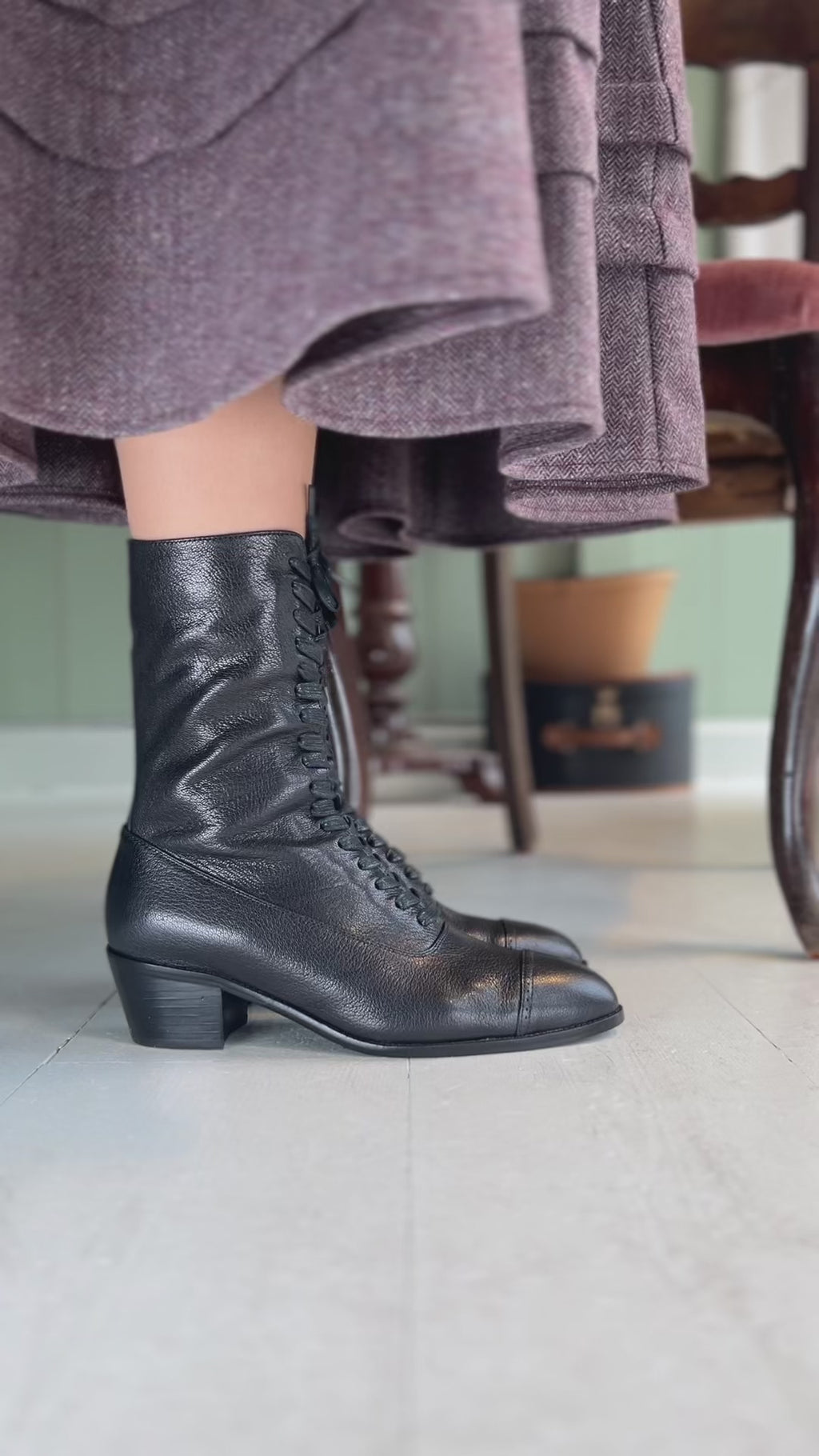 Støvlerne er typiske for for den Edwardianske periode (1890-1920) med langt tætsiddende snøret støvleskaft og spids snude. Støvlen har en 5,3 cm medium høj praktisk hæl. Indvendig er der foer af lærred og lædersåler - ligesom ved originale støvler fra denne periode.