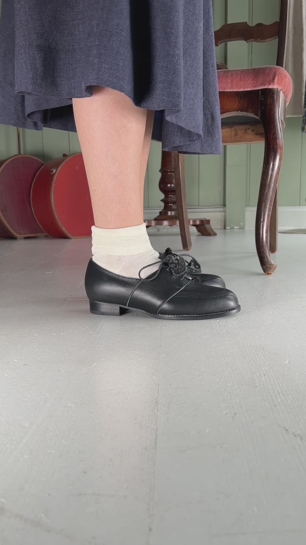 Den har en mandelformet tå med fine pyntesyninger og snørebånd med håndlavede blade – en smuk detalje, som var typisk for 40’erne. Den lave hæl giver god komfort og stabilitet, hvilket gør skoen ideel til daglig brug. Den er lavet af blødt kvalitetslæder (full-grain læder).