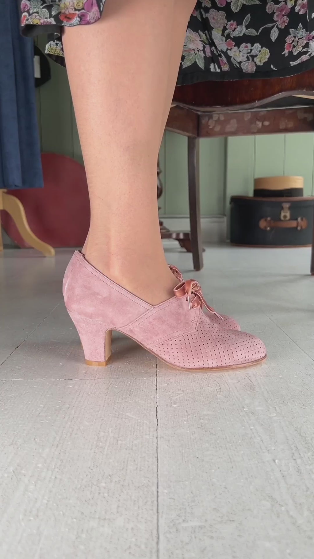 1940'er pumps i ruskind med snøre og hulmønster - Powder Rose - Esther